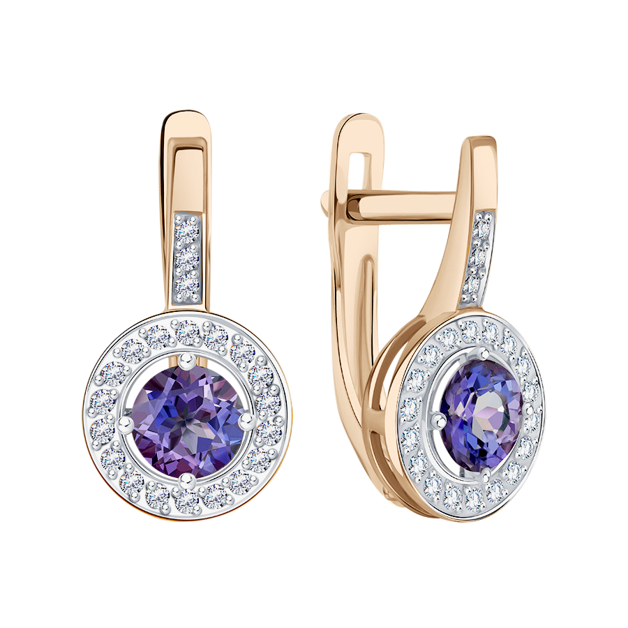 Earrings, Russian red gold 585, with tanzanite - diameter approx. 6 mm, with zirconia, diameter of the main part of the earrings approx. 10 mm, height approx. 18 mm